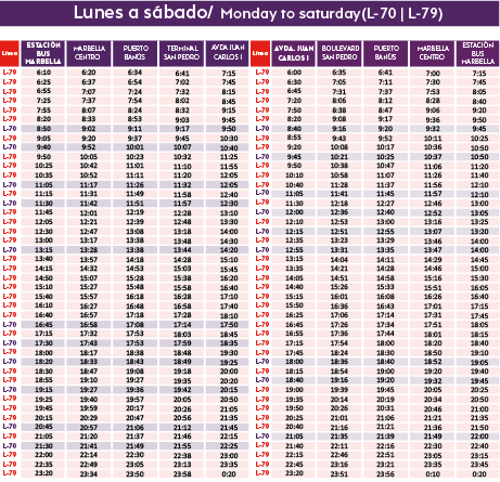 El servicio opera de lunes a viernes con salidas desde Marbella y Estepona a lo largo del día. El horario combinado con la línea L-79 es el siguiente: